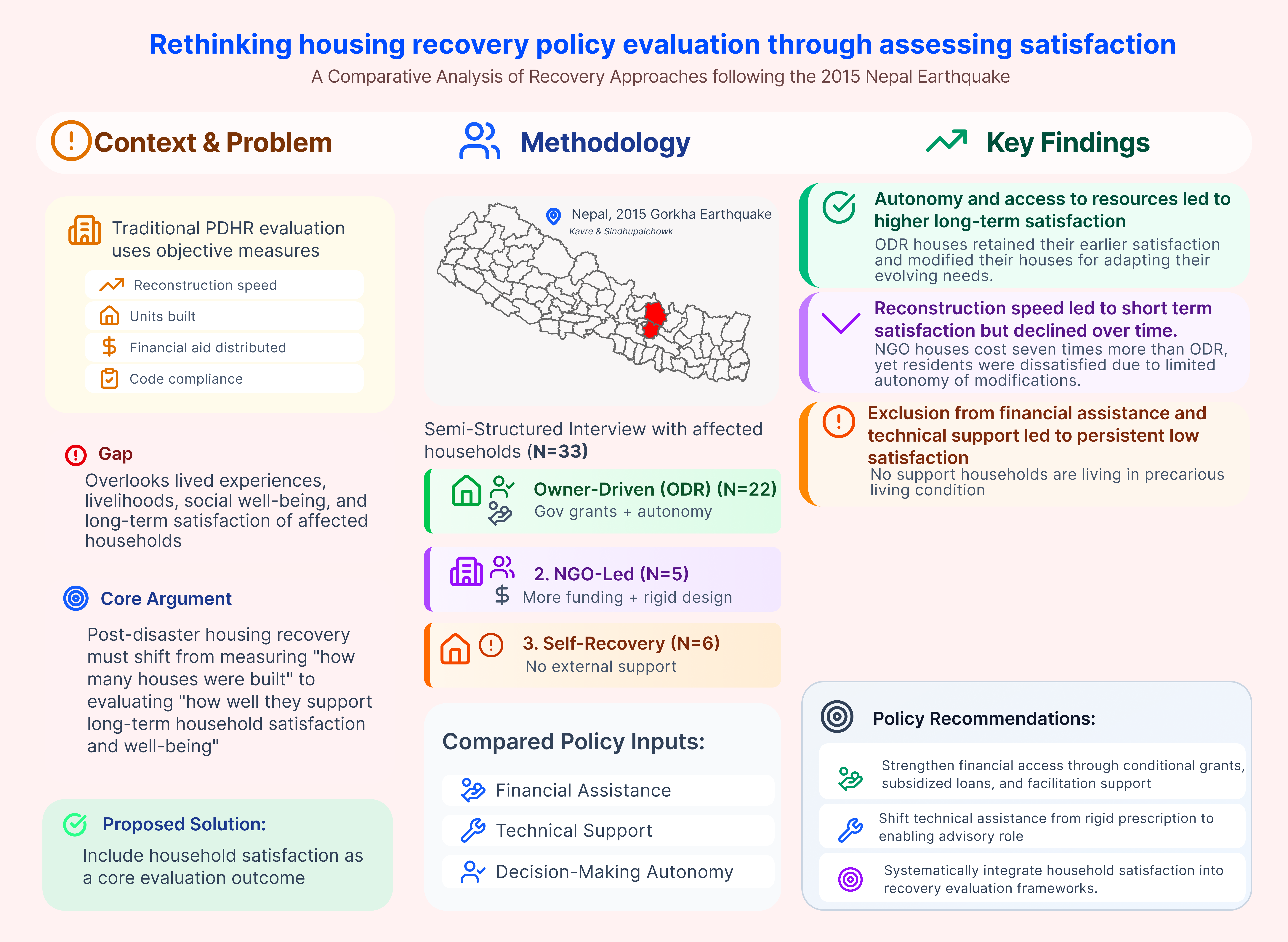 This study examines how short- and long-term household housing satisfaction can serve as a more meaningful measure of reconstruction outcomes reflecting affected households’ lived experiences.