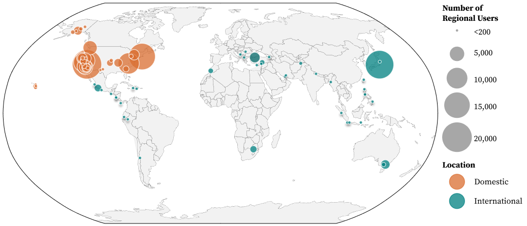 Web traffic data were analyzed for 80 earthquakes. Locations and number of regional users for earthquakes from 2019 to 2023 used in web traffic analysis.