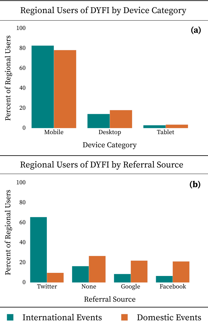 Earthquake-affected populations (regional users) physically and digitally access “Did You Feel It?” (DYFI) through different means. Bar charts show the number of regional users that access an event’s Felt Report page by (a) device category and (b) referral source aggregated across 40 domestic events (orange) and 40 international events (teal). Only the four most common referral sources are shown (b). The 2021 Mw 5.9 Chiba, Japan, accounts for 63% of all international regional users.