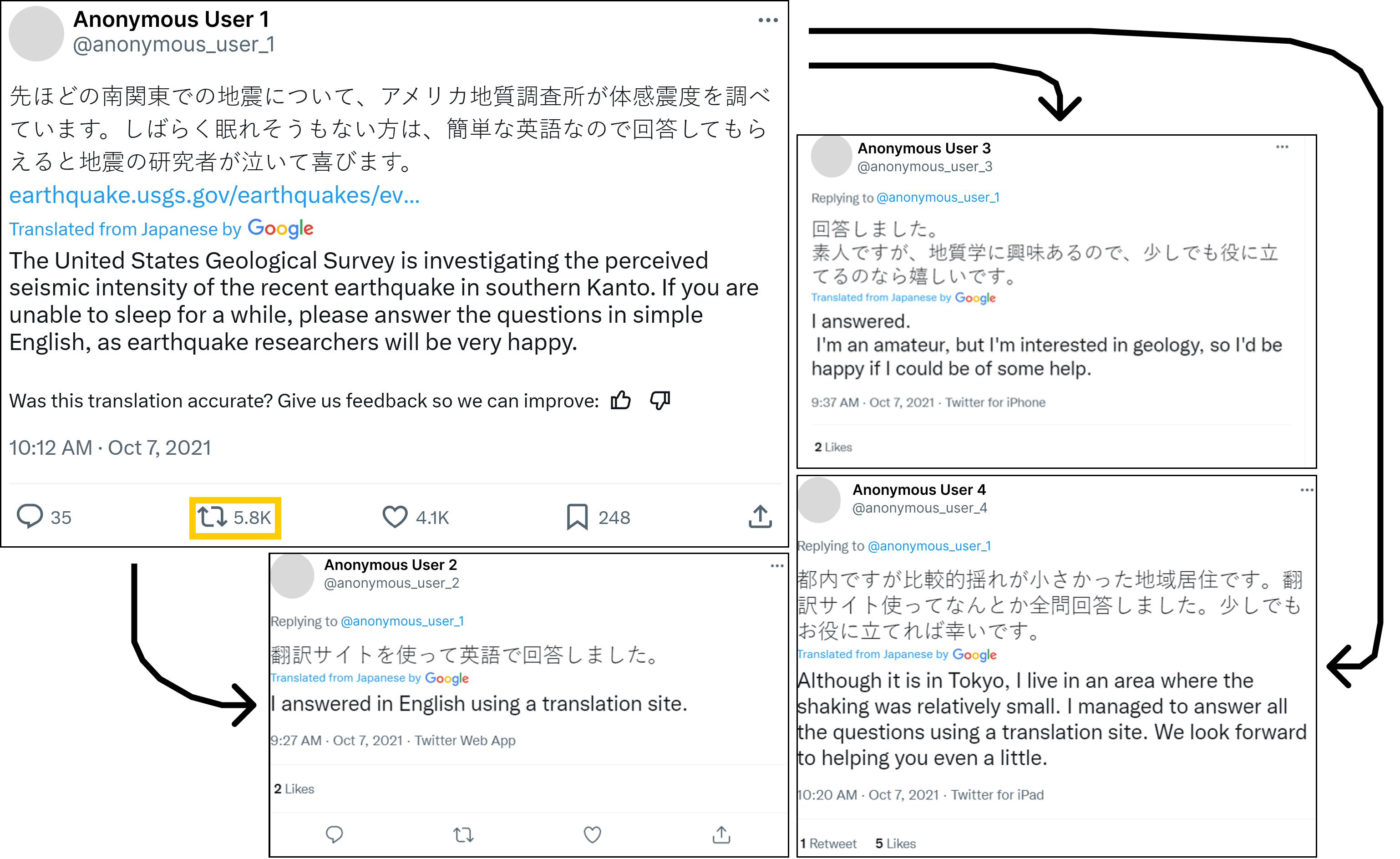 Social media can significantly increase DYFI interaction. Social media interactions surrounding “Did You Feel It?” and the 2021 Mw 5.9 Chiba, Japan, earthquake. Arrows point from the original tweet to responses to that tweet.