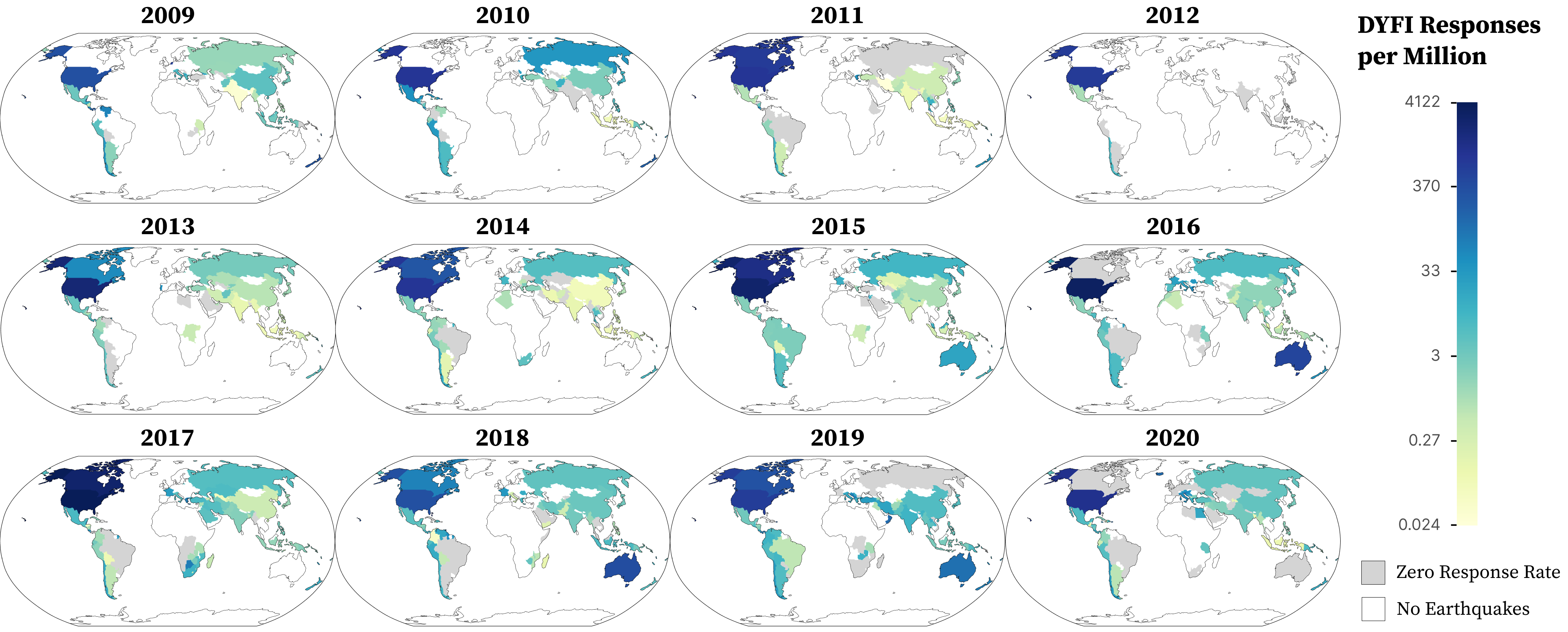 DYFI response rates over time. Grid of maps visualize response rate to DYFI for each year in the dataset (2009–2020). Response rates are transformed on a log scale and presented as DYFI responses per million people exposed to shaking. Countries are colored gray if they experienced earthquakes but had zero responses to DYFI for the year.