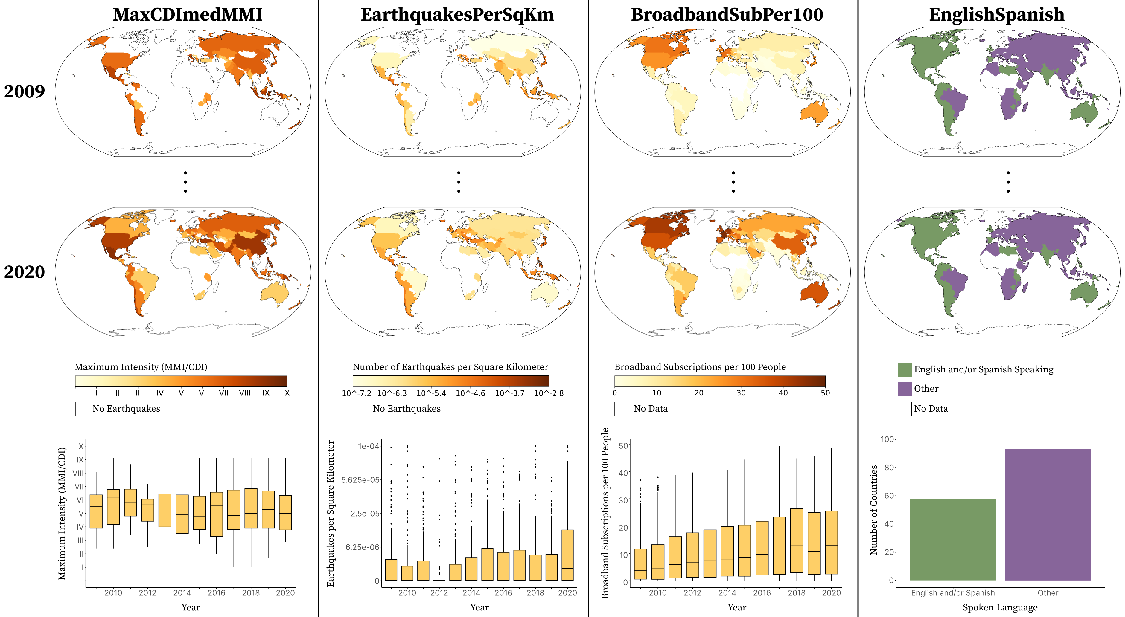 Explanatory variables over time. Grid of maps and charts visualize a subset of explanatory variables over time. Each column visualizes a different variable in the dataset: (a) MaxCDImedMMI, (b) EarthquakesPerSqKm (on a log scale), © BroadbandSubPer100, and (d) EnglishSpanish. These are the independent variables in the final statistical inference model. The first two rows show the spatial distribution of each variable for the first (2009) and last (2020) years of the compiled dataset. Intermediate years are not shown. The bottom row shows the temporal or categorical distribution of each variable. Each box in the box plot describes the variable’s distribution across all 151 countries in a given year. Box plots for EarthquakesPerSqKm and BroadbandSubPer100 have upper limits of 1 × 10−4 and 50, respectively, for visualization purposes. Missing values are not visualized. A bar chart is used for EnglishSpanish, because it is constant over time.