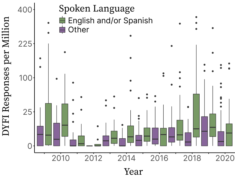 English- and Spanish-speaking countries tend to have higher DYFI response rates. Temporal box plots of response rate by country spoken language. For illustrative purposes, response rates are capped at 400 responses per million people exposed to shaking, and missing values are excluded from the visualization.