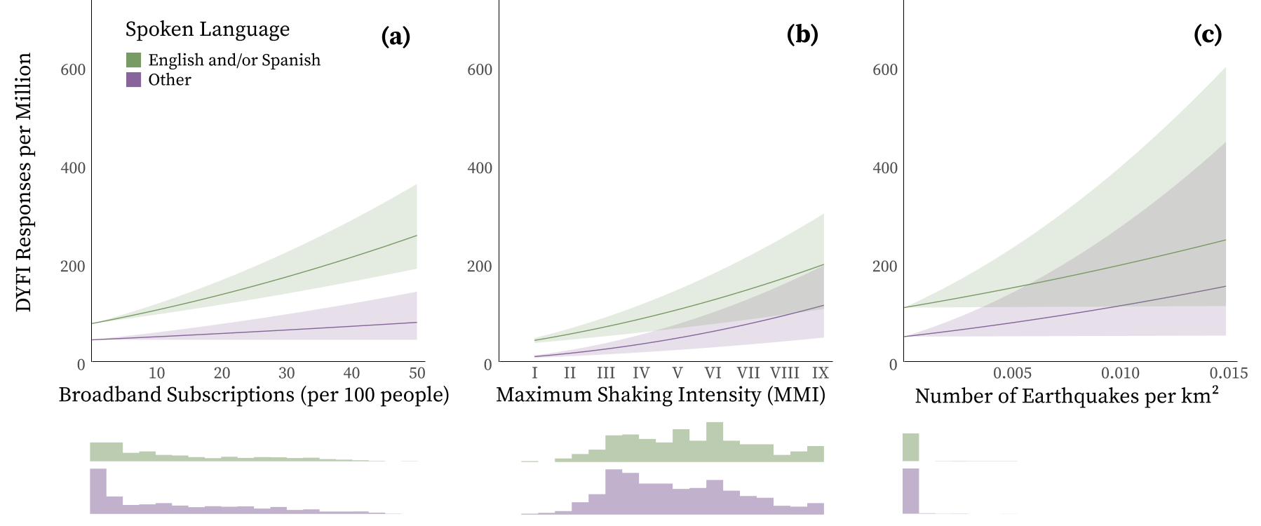 Individual variable impacts on DYFI response rate. Line plots with confidence bounds visualize the modeled relationship between quantitative explanatory variables and DYFI response rate, by country’s spoken language, while holding all other variables constant (at their mean value). Quantitative explanatory variables plotted are Broadband Subscriptions (a), Shaking Intensity (b), and Earthquake Density ©. Based on 100 bootstrapped samples, the lines correspond to the median coefficients, and the bounds reflect a 95% confidence interval derived from the same bootstrapping process. Response rate values were calculated using Equations 3-7. Below the plots are histograms of explanatory variables by country spoken language, including data from all years (2009–2020).