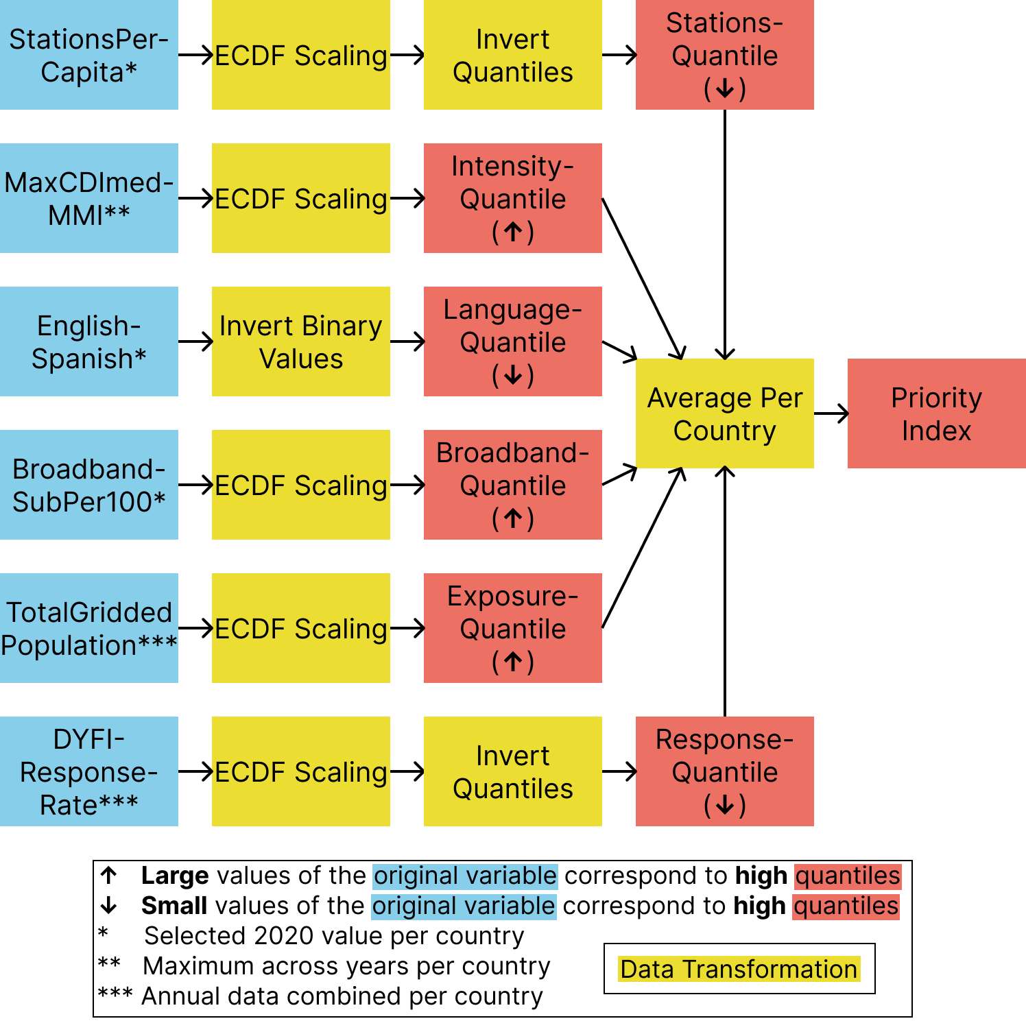 Calculating the country priority index. The diagram flows left to right, starting with input variables, transforming them into country quantiles, and averaging quantiles to create the priority index. Empirical cumulative distribution function (ECDF) scaling involves constructing an ECDF to assign country quantiles for each variable. For further details on the priority index calculation, see Figure 12.