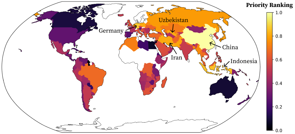 Mapped results of the composite priority index. Countries with the highest priority for improved DYFI accessibility are labeled. White-colored countries had no recorded earthquakes from 2009 to 2020.